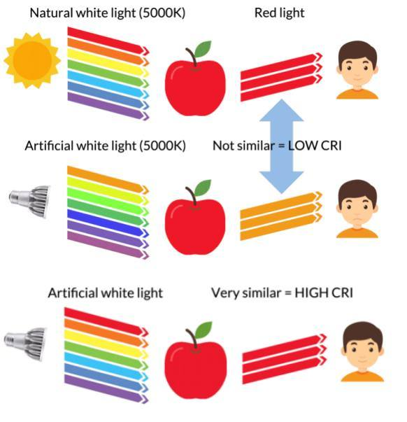 Hãy lấy một ví dụ như sau: Khi ánh sáng ban ngày (có 5000K CCT) chiếu vào quả táo thì chúng ta nhìn thấy màu đỏ, nhưng khi dùng ánh sáng nhân tạo từ đèn LED (cũng có 5000K CCT) thì chúng ta nhìn thấy quả táo màu cam.