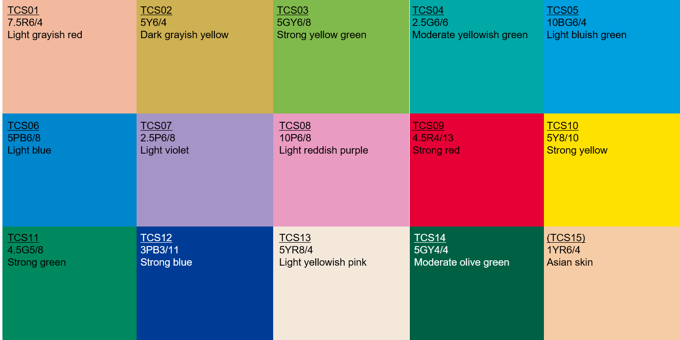 Nguồn sáng được đề cập hầu như sẽ được chiếu vào một loạt các mẫu màu ảo được gọi là mẫu màu thử nghiệm (TCS) với màu phản xạ được đo. Có tổng cộng 15 mẫu màu như hình dưới đây: