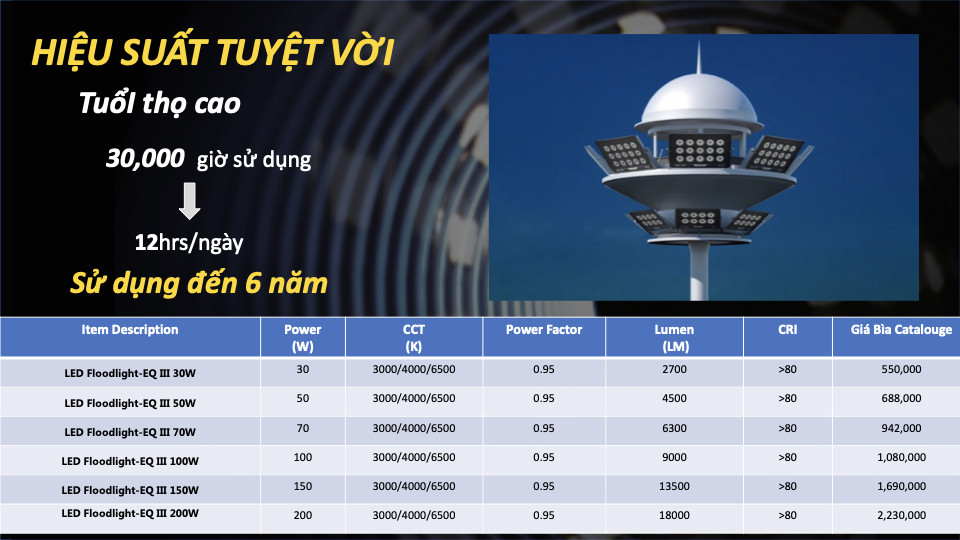 Đèn pha LED EQIII là sản phẩm chiếu sáng ngoài trời mới nhất của OPPLE. Đây là sự lựa chọn lý tưởng để chiếu sáng biển quảng cáo, sân vận động và sân bãi, ngay cả trong môi trường khắc nghiệt, với thiết kế đáng tin cậy vượt trội và chất lượng tuyệt vời.