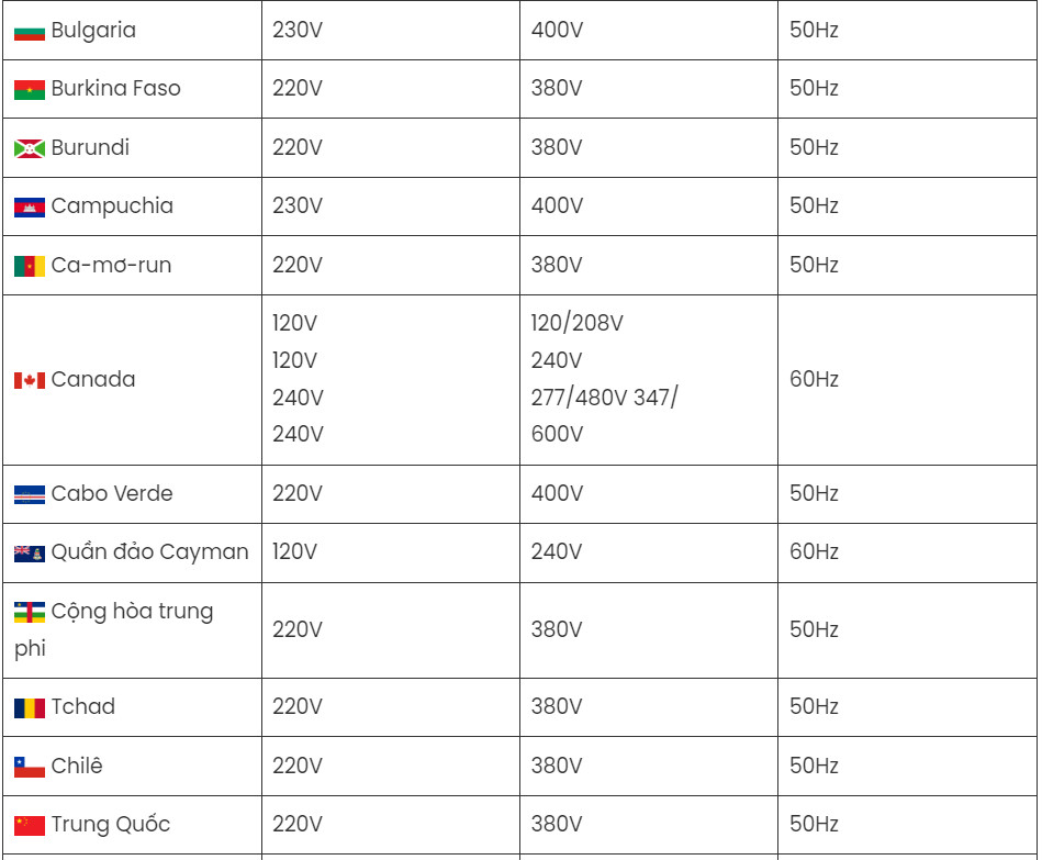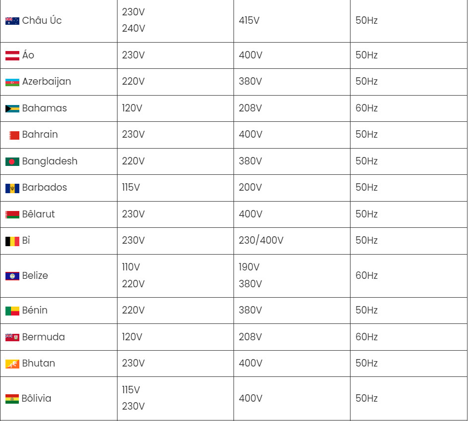 Theo IEC, danh sách dưới đây là các điện áp ‘dân dụng’ tiêu chuẩn được sử dụng trên toàn thế giới: