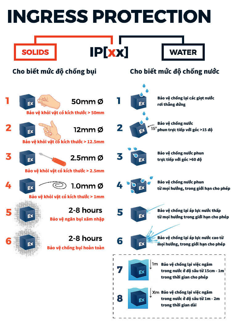 - Chỉ số IP (Ingress Protection): Chống bụi và nước. Ví dụ: IP20 cho phòng khô, IP44 cho nhà bếp, IP65 cho ngoài trời.